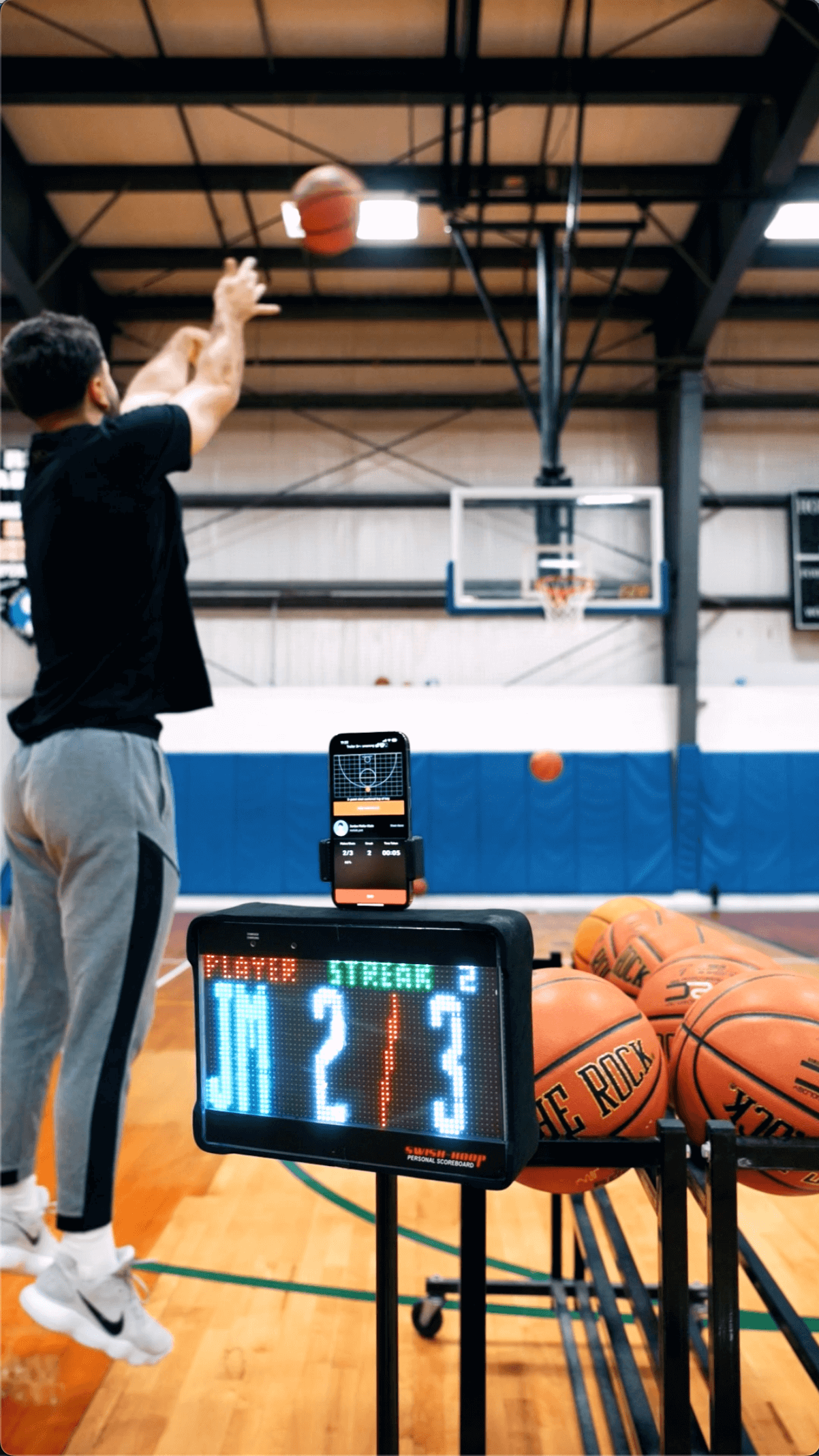 Swish Hoop is a great low cost way to track shots and stats. When you add the scoreboard, everything becomes much more interactive. My son loves the dribbling challenge as well as the fire symbol after he makes 3 shots in a row.