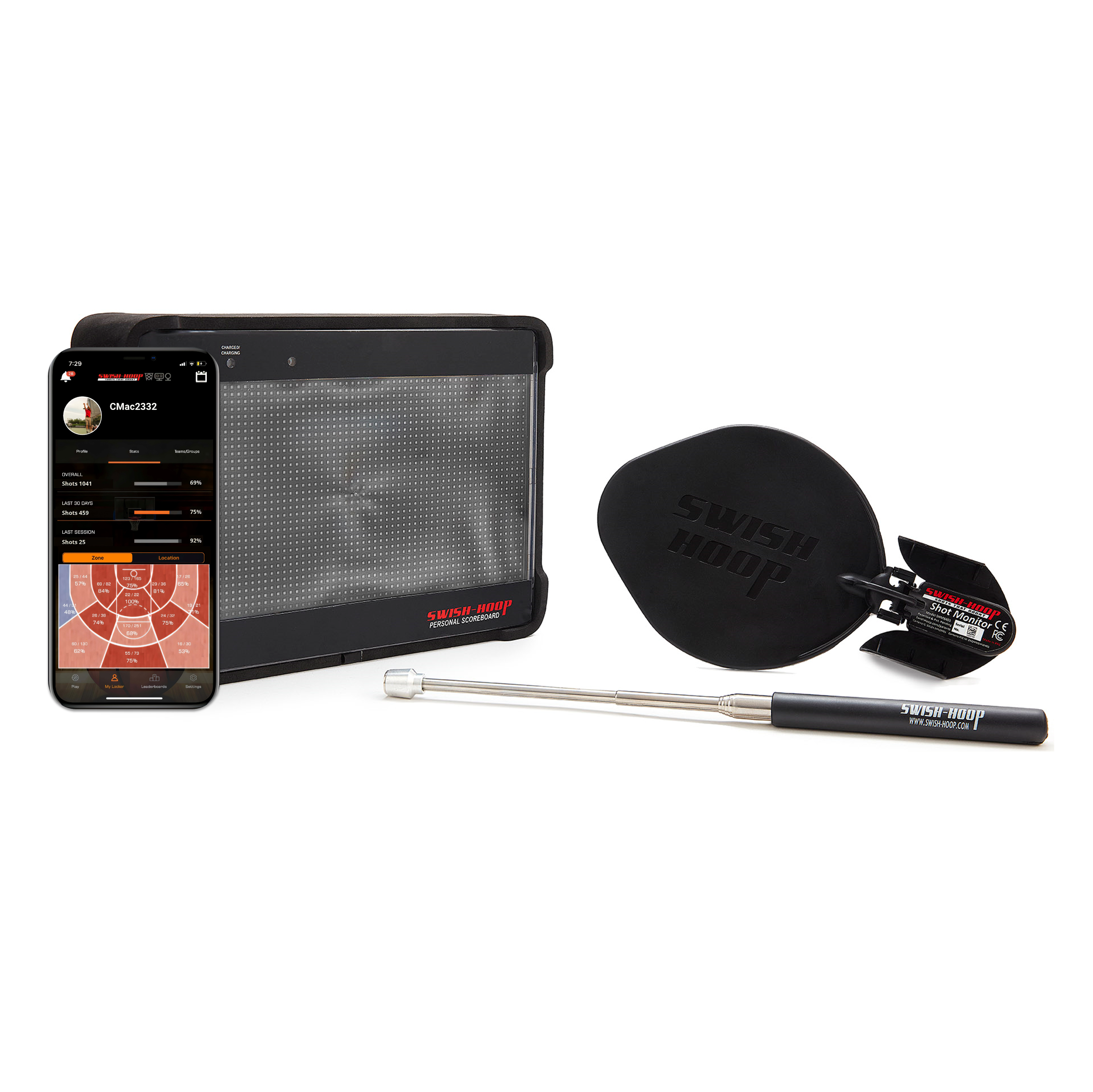 TheSwish Hoop®Basketball Skills Trainer comes complete with one Swish Hoop®Shot Monitor and one Swish Hoop®Personal Scoreboard, as well as the free iOS and Android mobile app that may be downloaded to your smartphone or tablet. Electronically track your shots and get courtside feedback of your shooting and dribbling workouts in real time.
